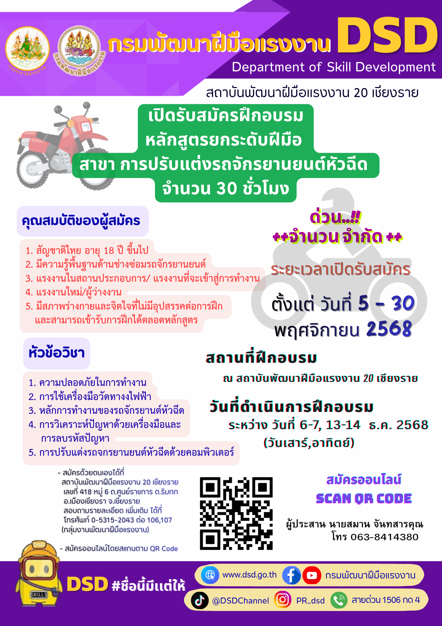 สถาบันพัฒนาฝีมือแรงงาน20เชียงราย รับสมัครฝึกอบรมหลักสูตร การปรับแต่งรถจักรยานยนต์หัวฉีด จำนวน 30 ชั่วโมง