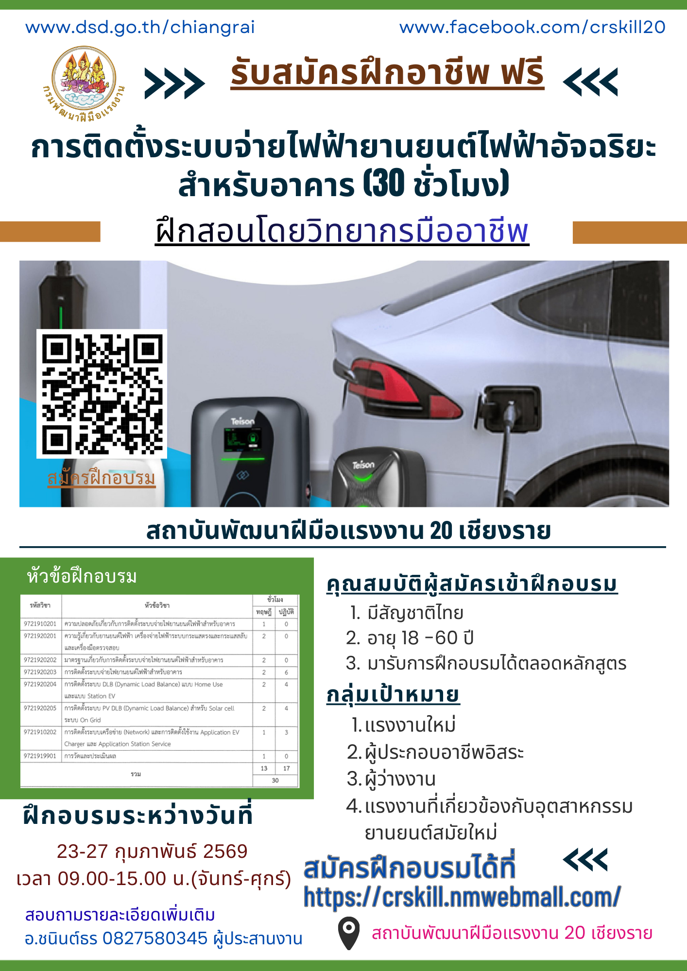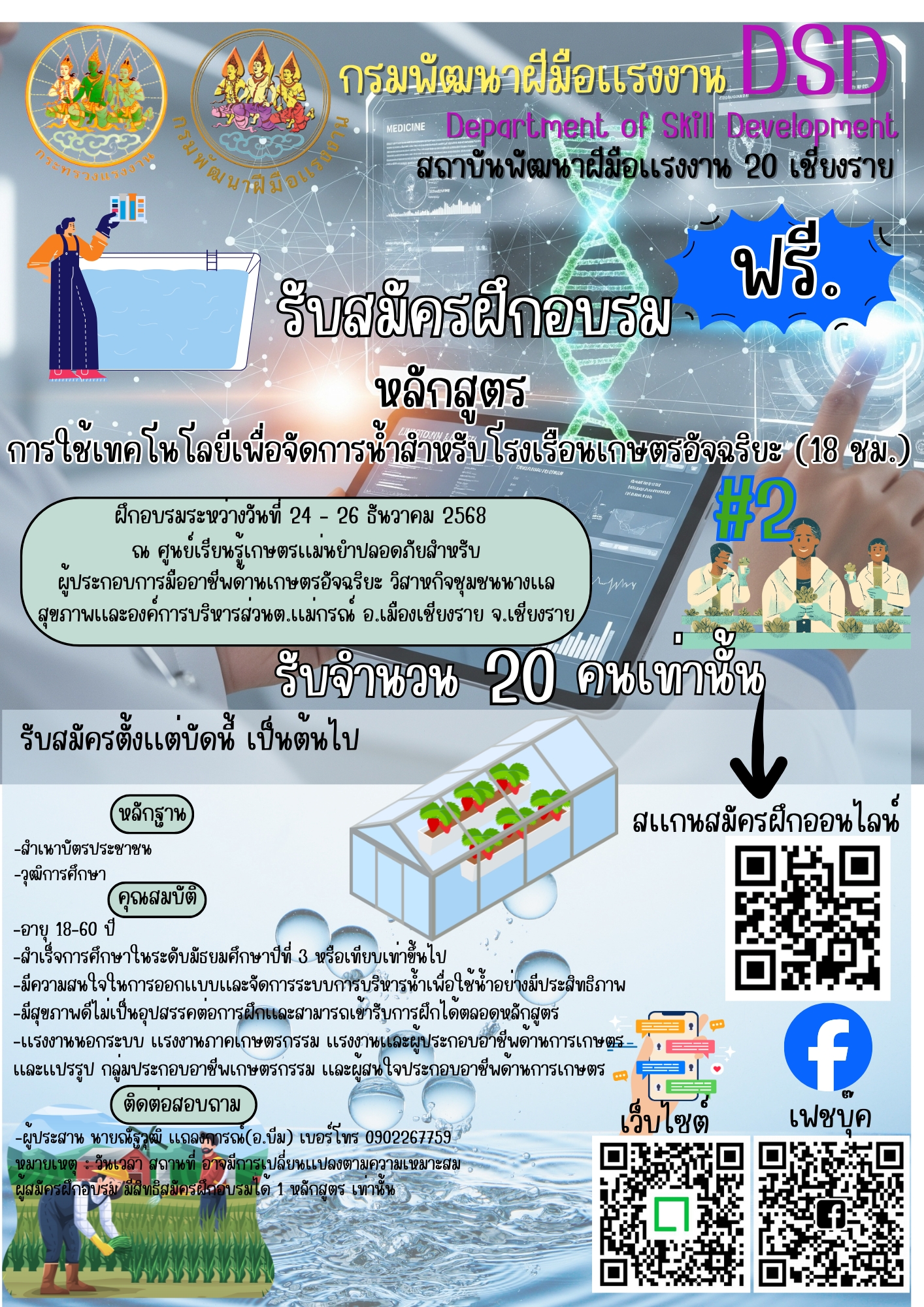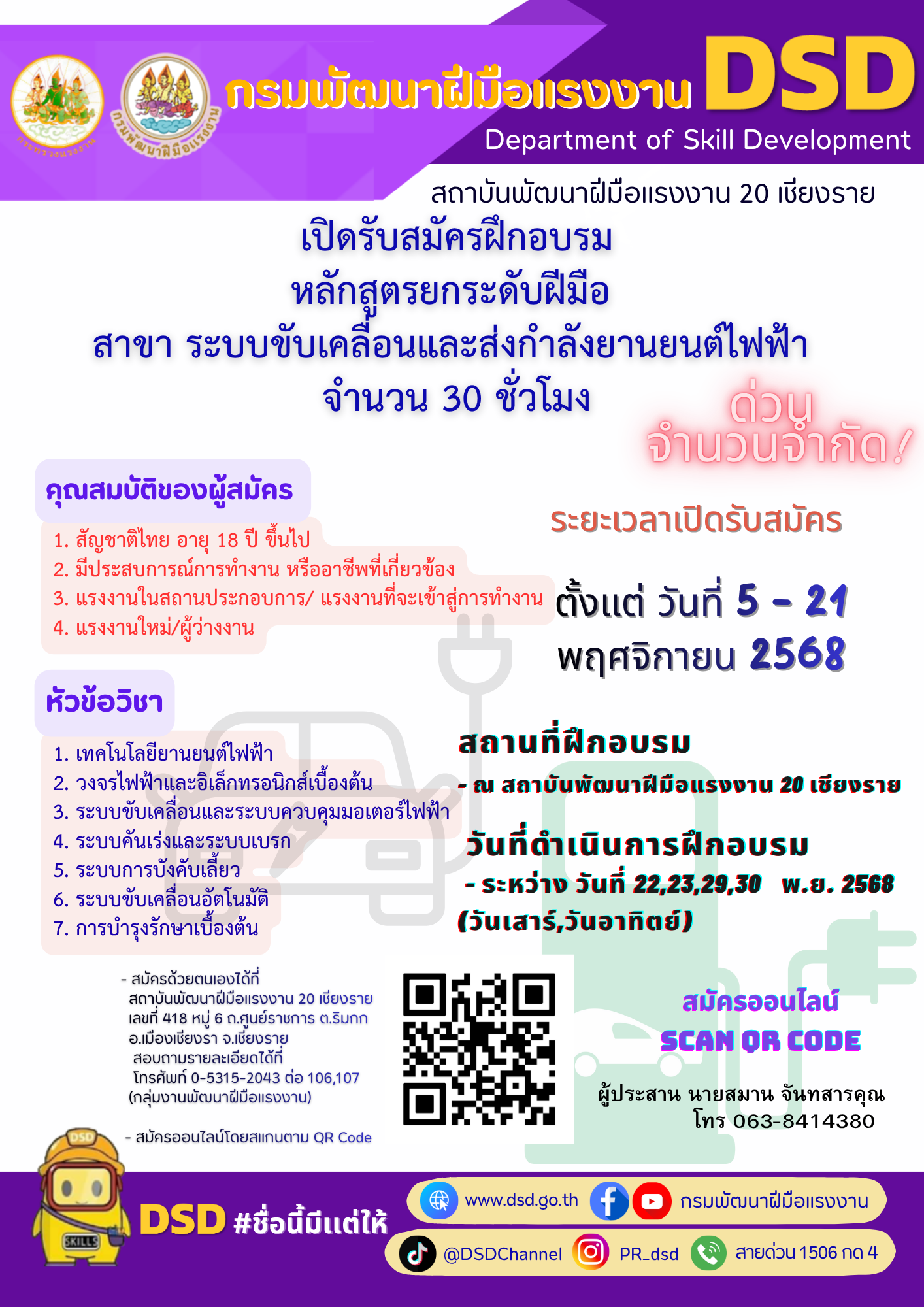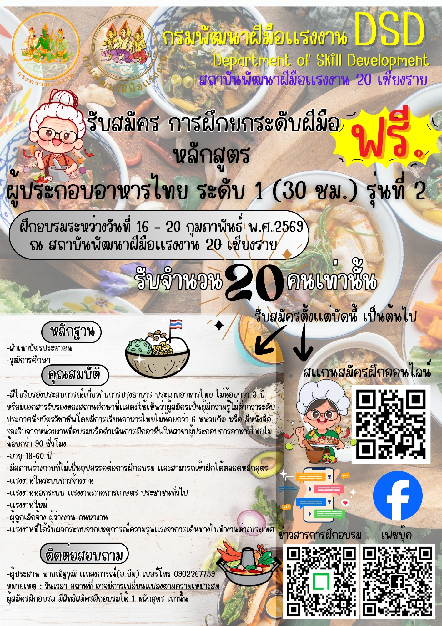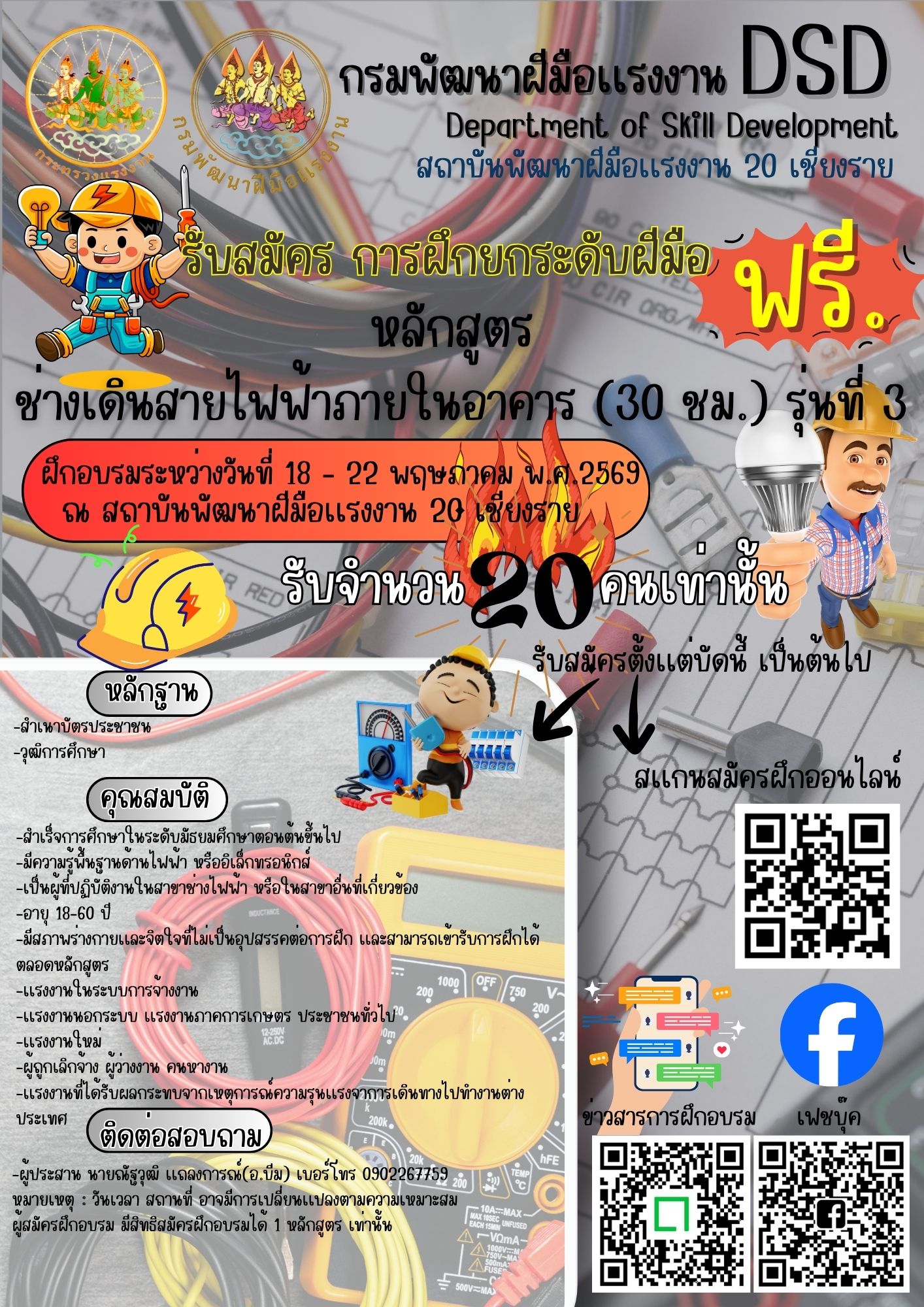 ฝึกอบรมระหว่างวันที่ 8 - 12 มิถุนายน พ.ศ.2569 ณ สถาบันพัฒนาฝีมือเเรงงาน 20 เชียงราย